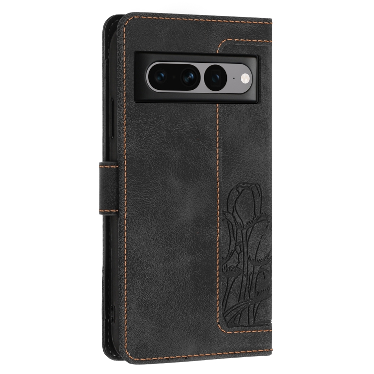 Funda de Cuero con Relieve de Tulipanes para Google Pixel 7 Pro con Cordón (Negro)
