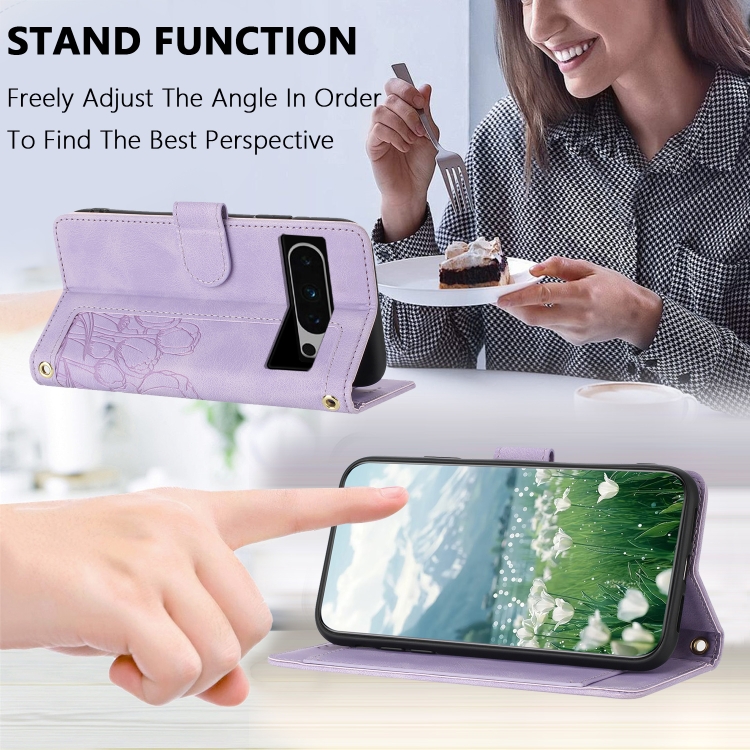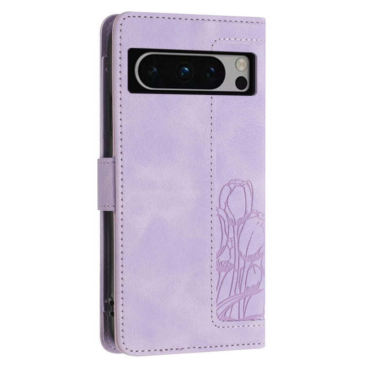Funda de Cuero con Relieve de Tulipanes para Google Pixel 8 Pro con Cordón (Morado)