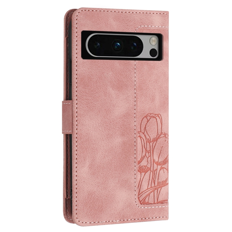 Funda de Cuero con Relieve de Tulipanes para Google Pixel 8 Pro con Cordón (Rosa)