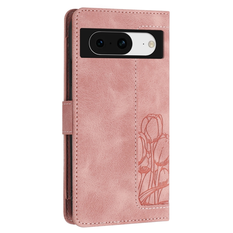 Funda de Cuero con Relieve de Tulipanes para Google Pixel 8A con Cordón (Rosa)