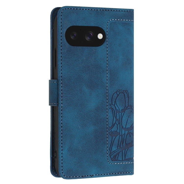 Funda de Cuero con Relieve de Tulipanes para Google Pixel 9A con Cordón (Azul)