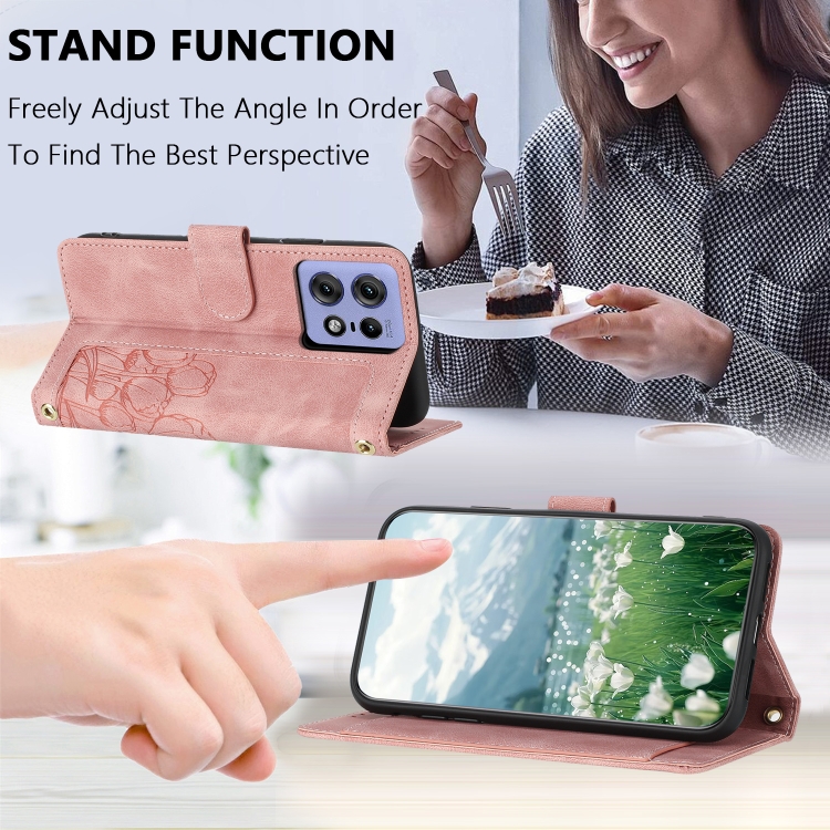 Funda de Cuero con Relieve de Tulipanes para Motorola Edge 50 Pro con Cordón (Rosa)