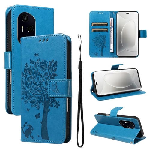 Funda de Cuero con Tapa para Honor 300 Pro/300 U1Tra con Diseño Árbol y Gato en Relieve (Azul)