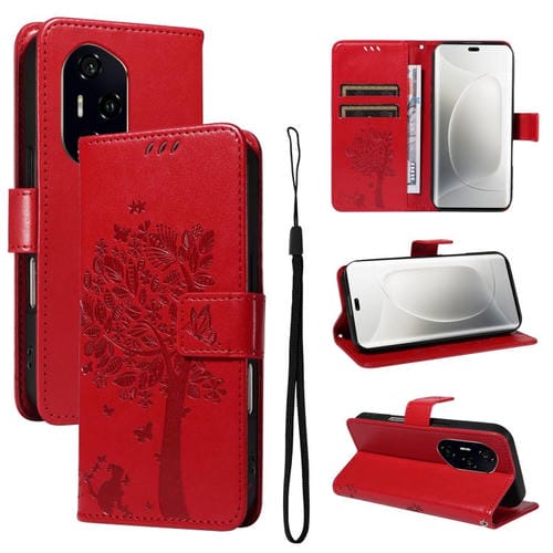 Funda de Cuero con Tapa para Honor 300 Pro/300 U1Tra con Diseño Árbol y Gato (Rojo)