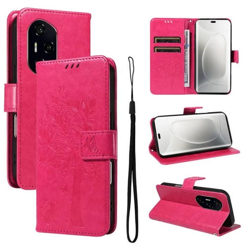 Funda de Cuero con Tapa para Honor 300 Pro/300 U1Tra Diseño Árbol y Gato (Rosa Rojo)