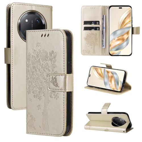 Funda de Cuero con Tapa para Honor X9C 5G Global con Estampado de Árbol y Gato (Dorada)