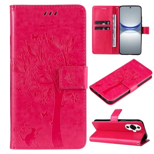 Funda de Cuero con Tapa para Huawei Nova 12S con Diseño Árbol y Gato En Relieve (Rosa Rojo)