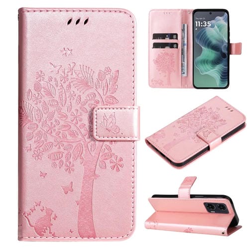 Funda de Cuero con Tapa para Motorola Moto G35 con Diseño Árbol y Gato en Relieve (Oro Rosa)