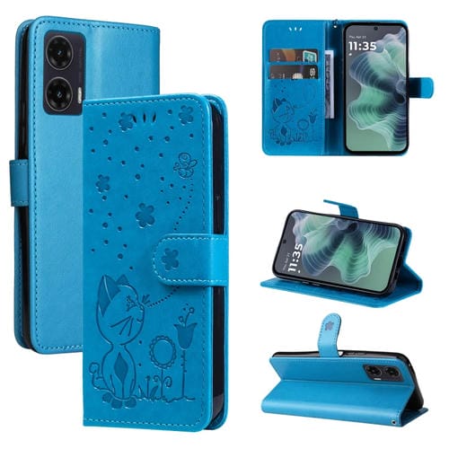 Funda de Cuero con Tapa para Motorola Moto G35 con Diseño de Gato y Abeja (Azul)