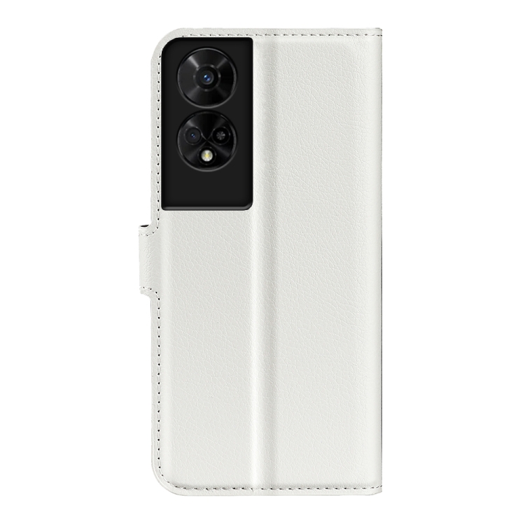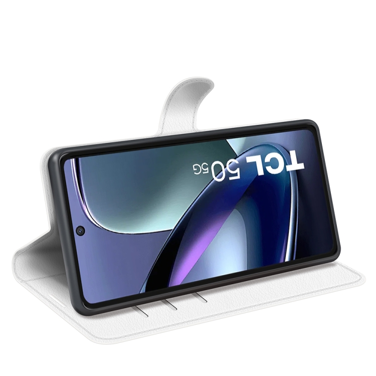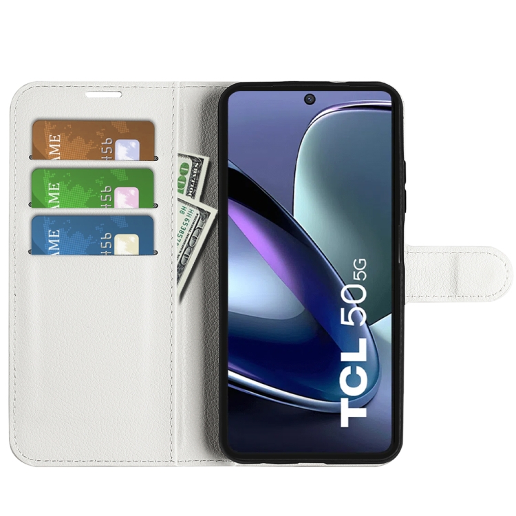 Funda de Cuero con Tapa Horizontal y Textura de Lichi para TCL 50 5G con Soporte (Blanco)