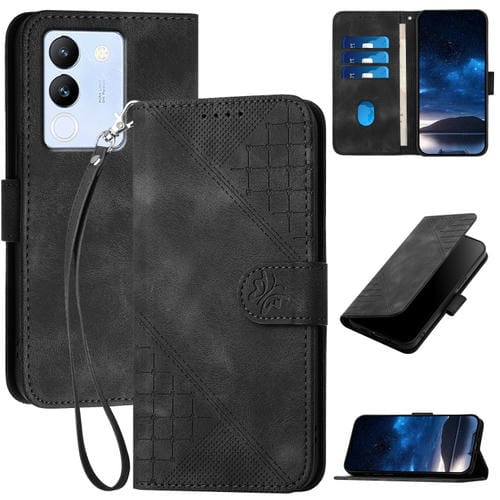Funda de Cuero con Tapa y Cordón para Vivo V30 Lite 5G Global Yx0080 con Diseño En Relieve de Mariposa y Cuadrícula (Negro)
