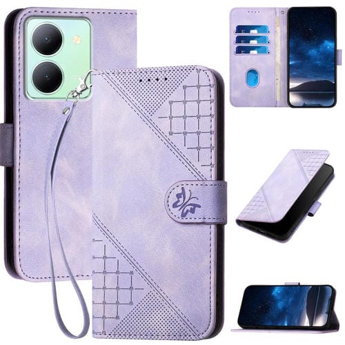 Funda de Cuero con Tapa y Cordón para Vivo Y27S 4G Global Yx0080 con Diseño En Relieve de Mariposa y Cuadrícula (Morado Claro)
