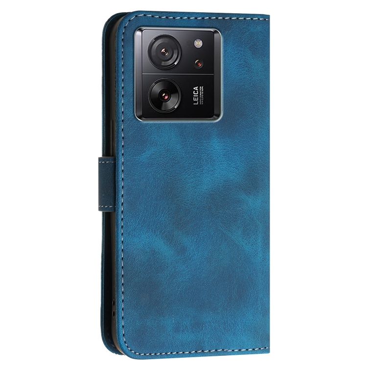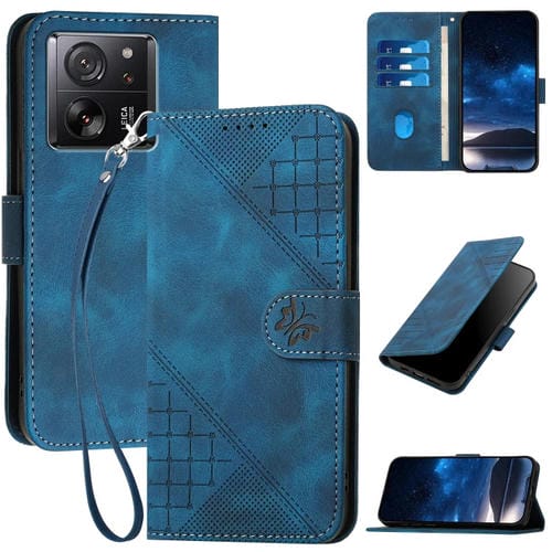 Funda de Cuero con Tapa y Cordón para Xiaomi 13T Yx0080 con Diseño de Mariposas En Relieve (Azul Oscuro)
