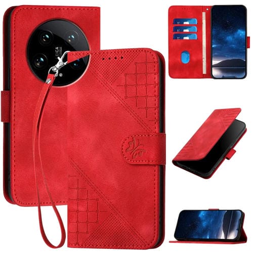 Funda De Cuero Con Tapa Y Cordón Para Xiaomi 14 Ultra Yx0080 Con Diseño De Mariposa En Relieve Y Cuadrícula (Rojo)