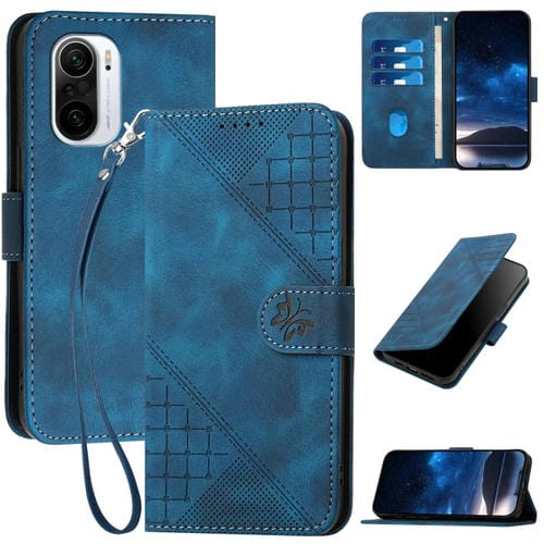 Funda de Cuero con Tapa y Cordón para Xiaomi Poco F3 Yx0080 con Diseño de Mariposa En Relieve y Cuadrícula (Azul Oscuro)