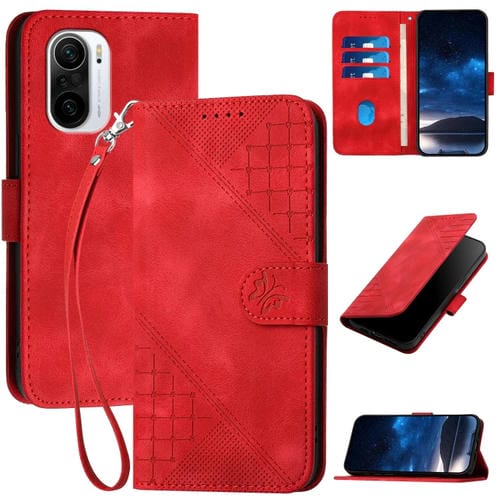 Funda de Cuero con Tapa y Cordón para Xiaomi Poco F3 Yx0080 con Diseño de Mariposa En Relieve y Cuadrícula (Rojo)
