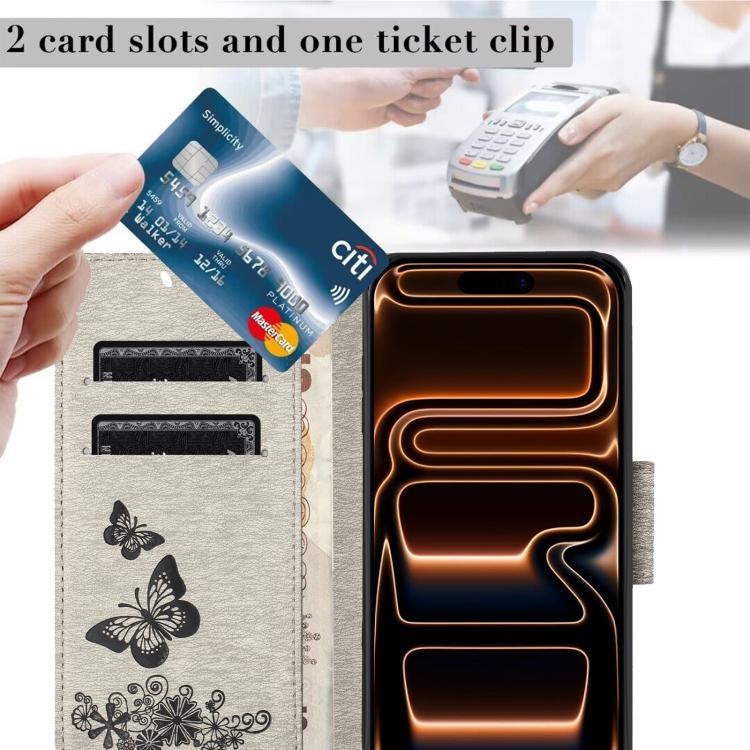 Funda de cuero con tapa y diseño de mariposas en relieve para iPhone 17 Pro (gris)
