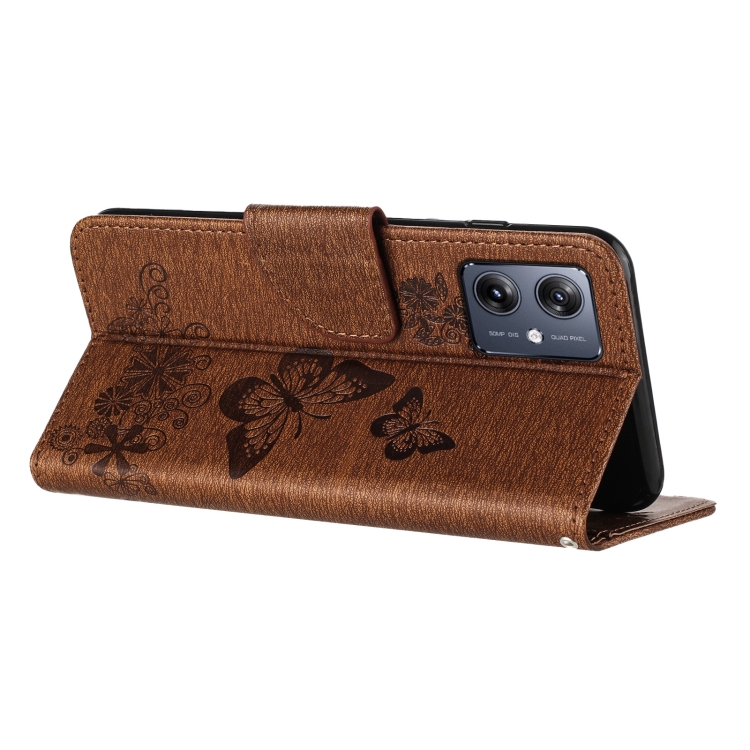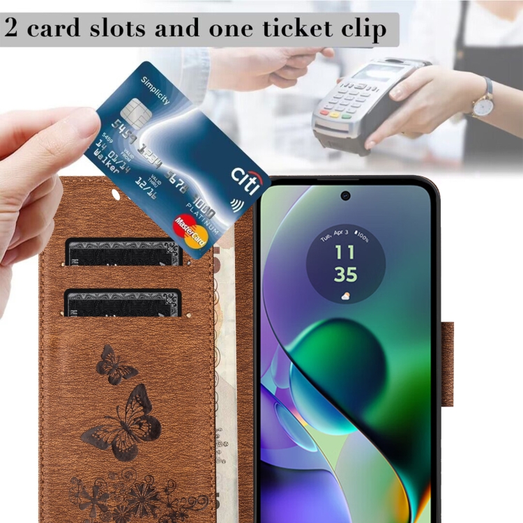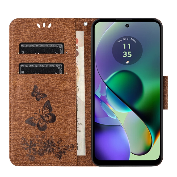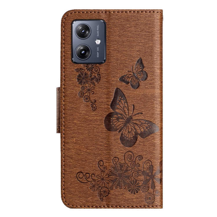 Funda de Cuero con Tapa y Mariposas en Relieve para Motorola Moto G35 (Marrón)