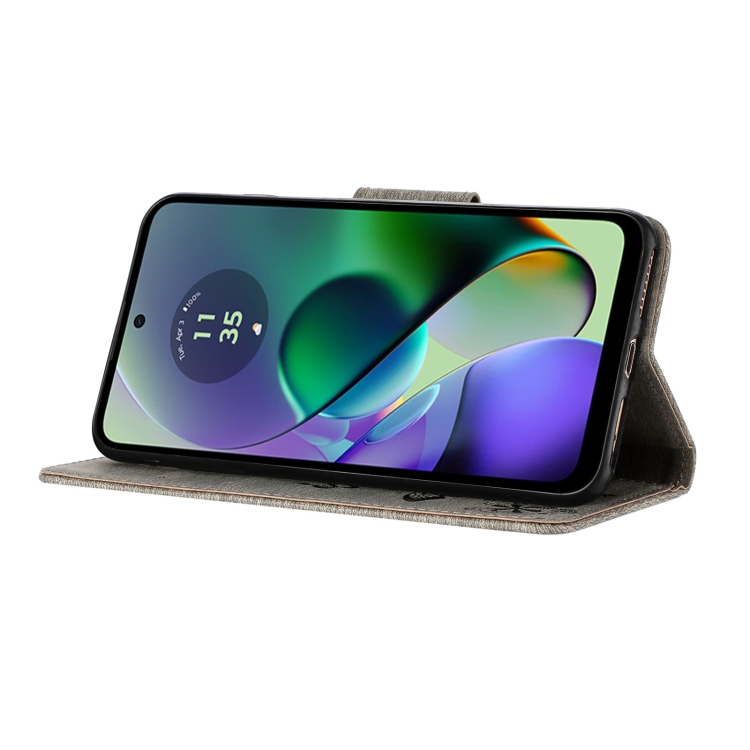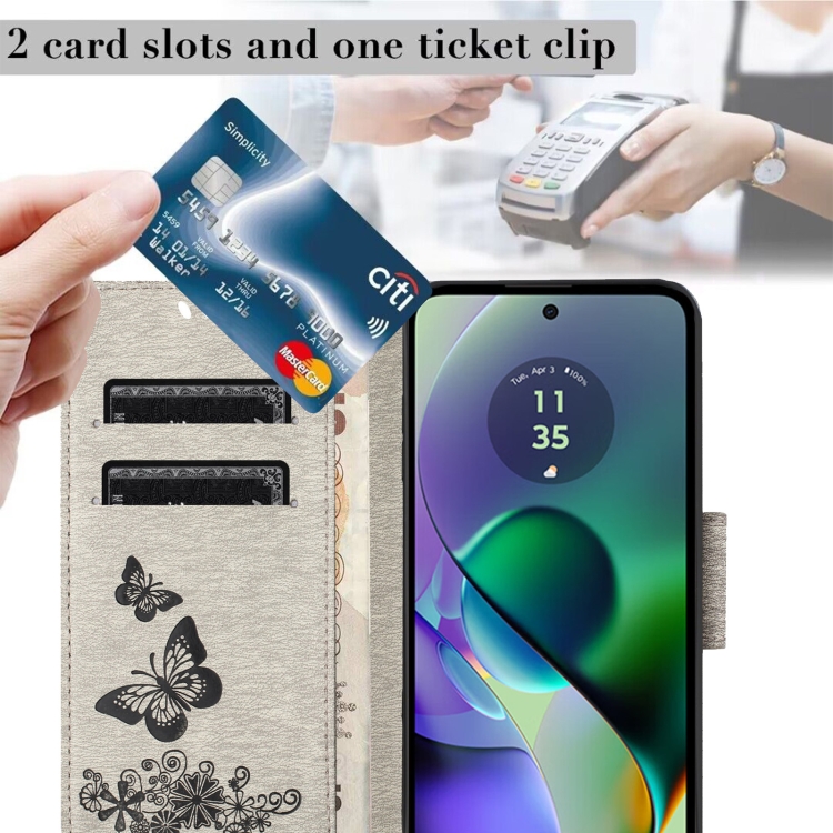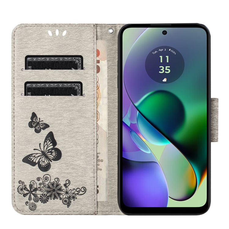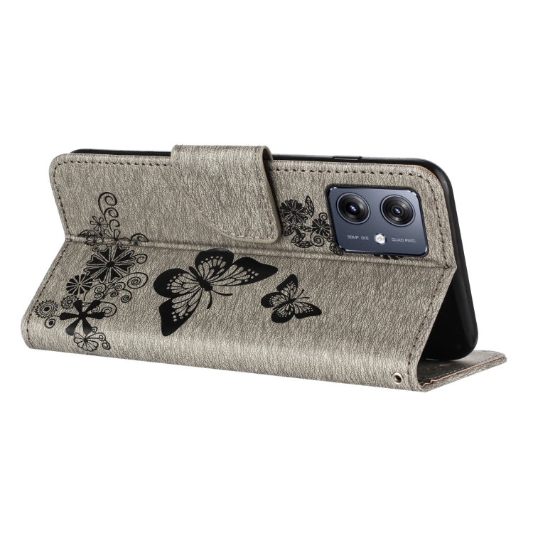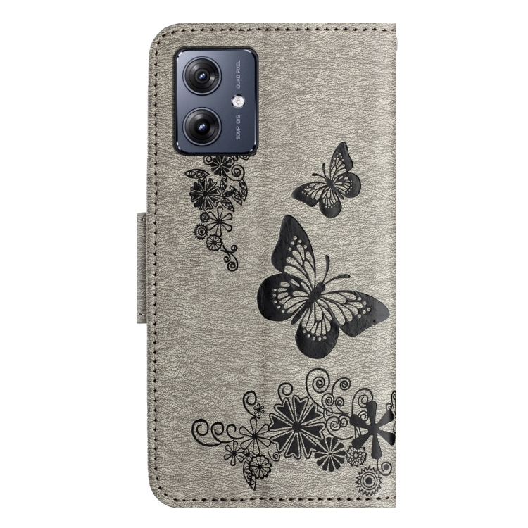 Funda de Cuero con Tapa y Mariposas en Relieve para Motorola Moto G55 (Gris)