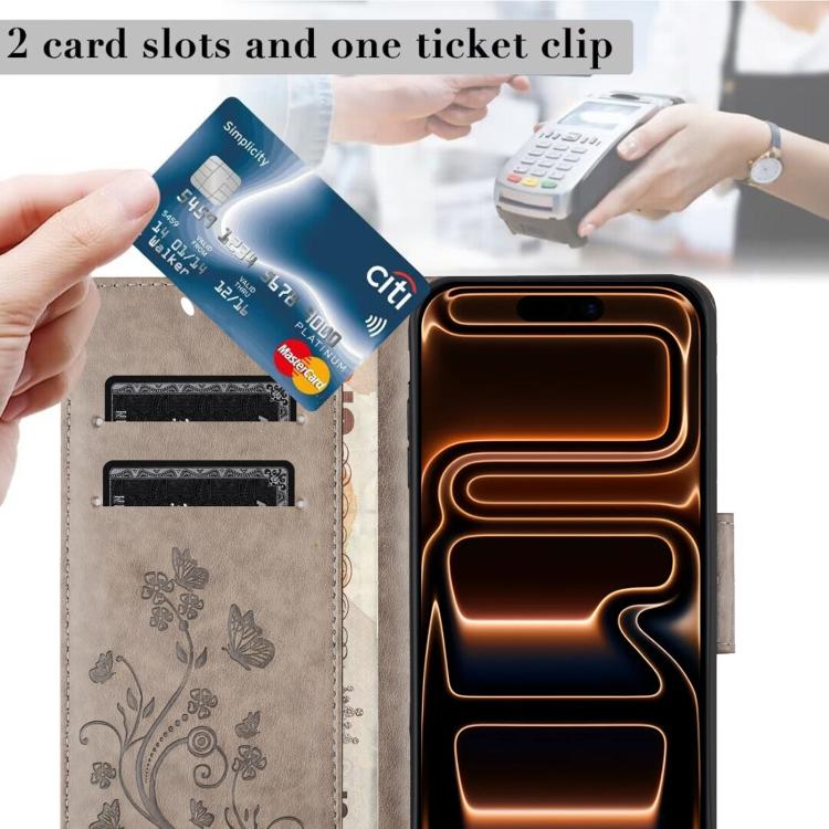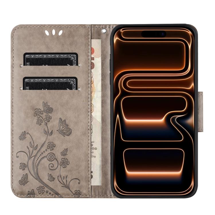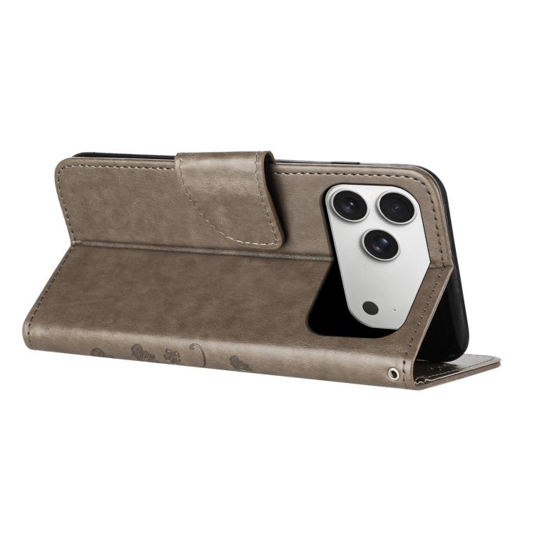 Funda de cuero con tapa y diseño de mariposas y flores para iPhone 17 Pro Max (gris)