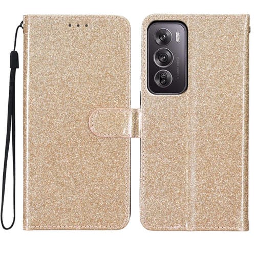 Funda de Cuero con Tapa y Purpurina para Oppo Reno12 Pro (Dorada)