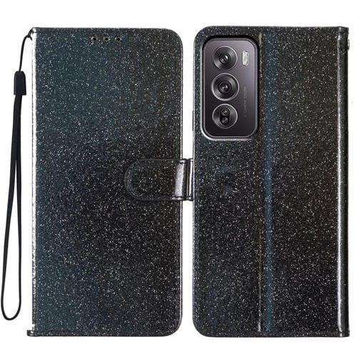 Funda de Cuero con Tapa y Purpurina para Oppo Reno12 Pro (Negro)