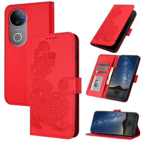 Funda de Cuero con Tapa y Relieve de Flor de Datura para Vivo V50 (Roja)