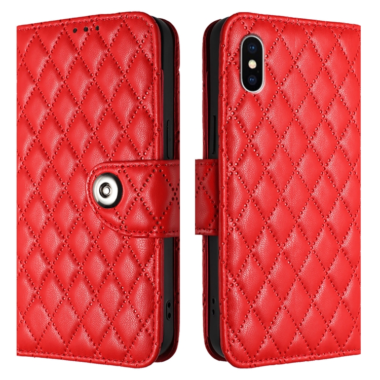 Funda de Cuero con Tapa y Textura Rómbica para iPhone Xs/X con Cordón (Rojo)