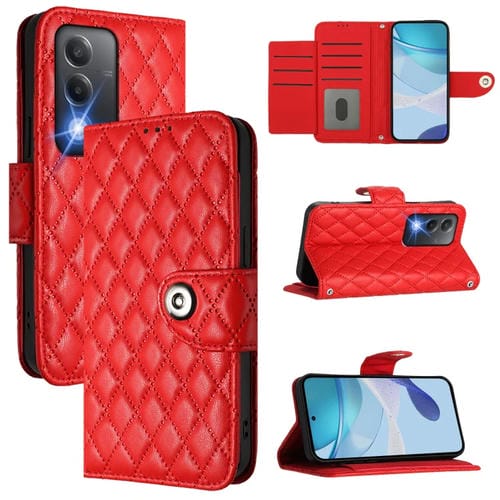 Funda de Cuero con Tapa y Textura Rómbica para Teléfono Oppo A3 Pro 5G de la India con Cordón (Rojo)