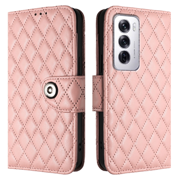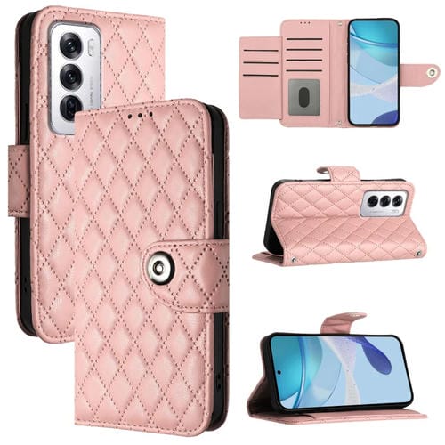 Funda de Cuero con Tapa y Textura Rómbica para Teléfono Oppo Reno12 5G Global con Cordón (Rosa Coral)