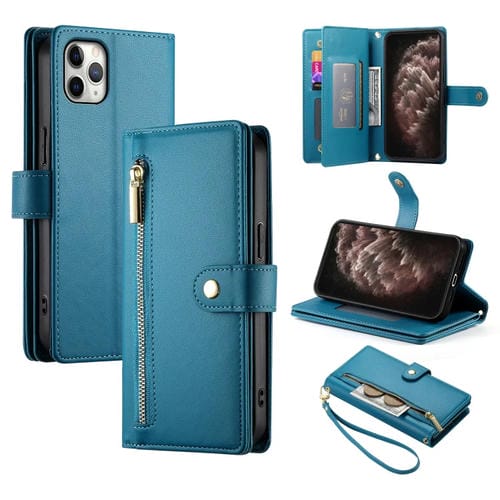 Funda de Cuero para Teléfono iPhone 11 Pro Max con 9 Ranuras para Tarjetas y Cremallera (Azul)