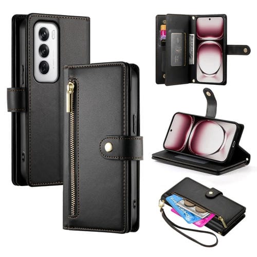 Funda de Cuero para Teléfono con Nueve Ranuras para Tarjetas y Cremallera para Oppo Reno12 Global (Negro)
