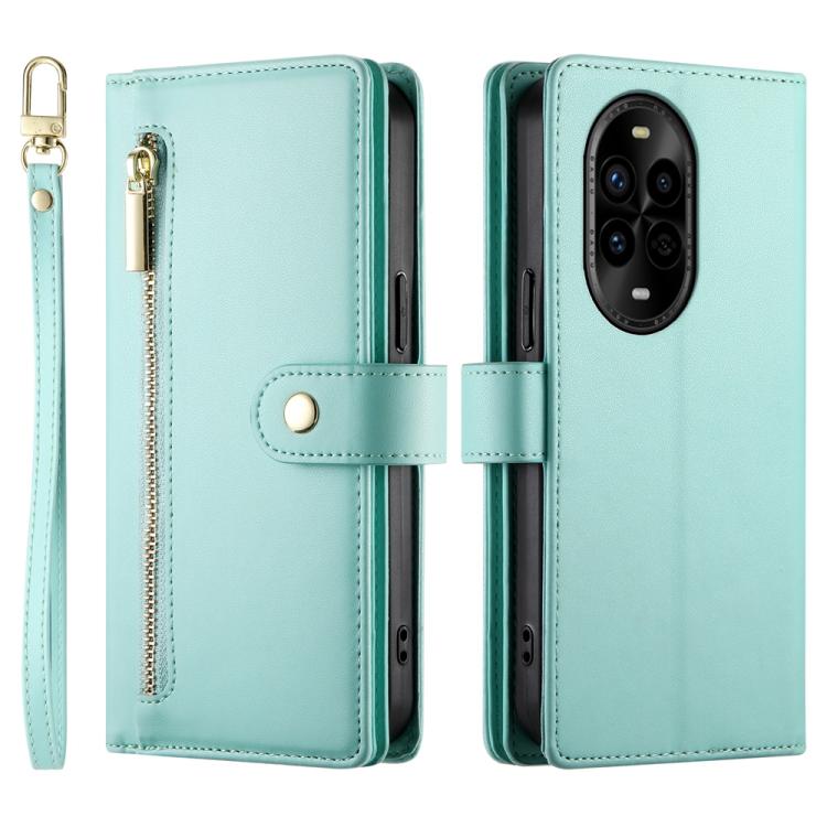 Funda de Cuero Huawei Nova 13 Pro con 9 Ranuras para Tarjetas y Cremallera (Verde Menta)