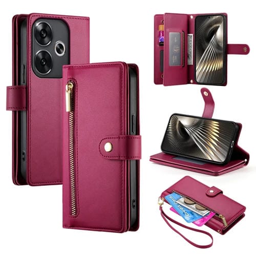 Funda de Cuero para Teléfono Redmi Turbo 3 con Nueve Ranuras para Tarjetas y Cremallera (Rojo)