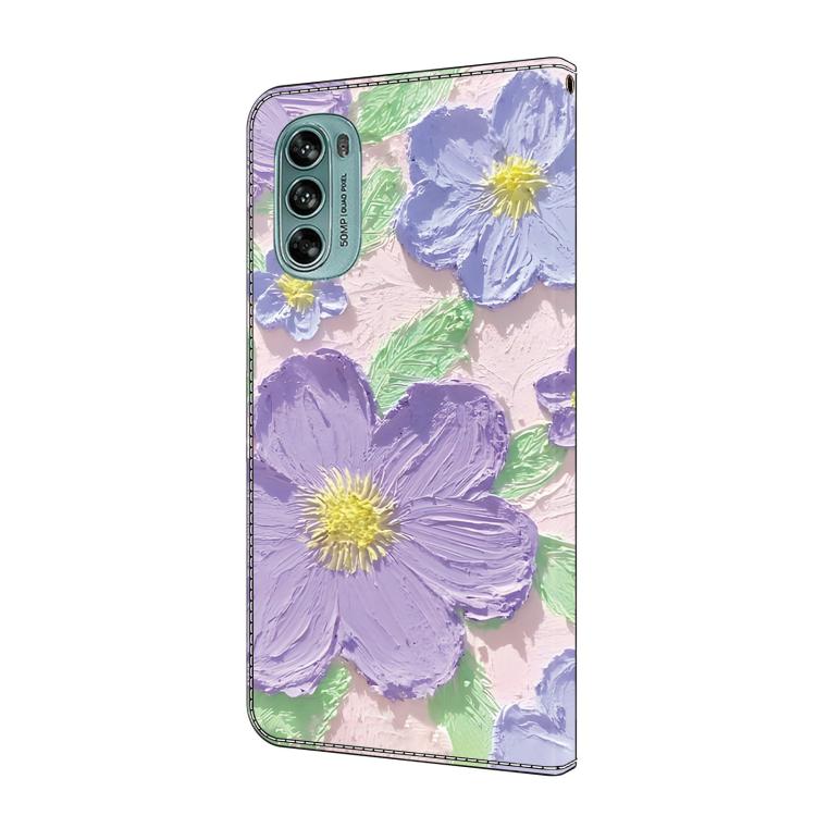 Funda de Cuero Pintada a Mano Motorola Moto G62 5G con Pintura al Óleo Flores Moradas