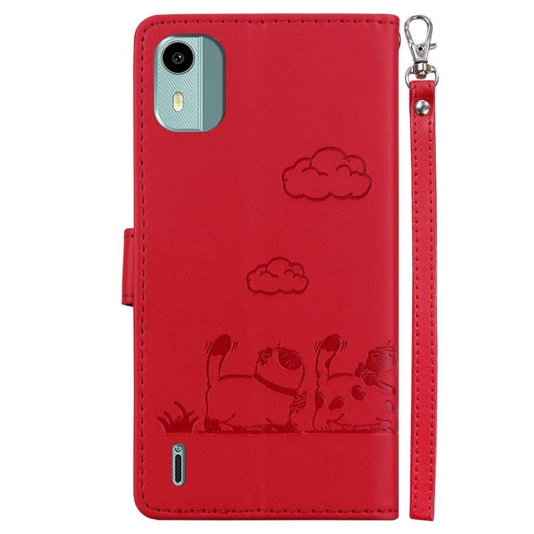 Funda de Cuero Rfid para Nokia C12 con Diseño de Gatos (Roja)