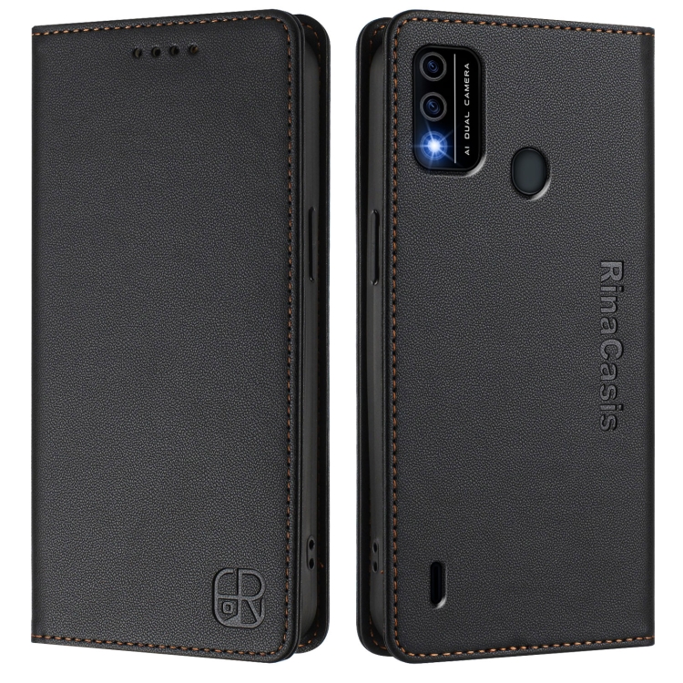 Funda de Cuero Rfid para Teléfono Itel A48 Rc01 con Doble Pliegue y Succión Magnética (Negra)