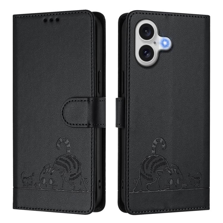 Funda de cuero RFID con estampado de gato y rata para iPhone 17 con cordón (negra)