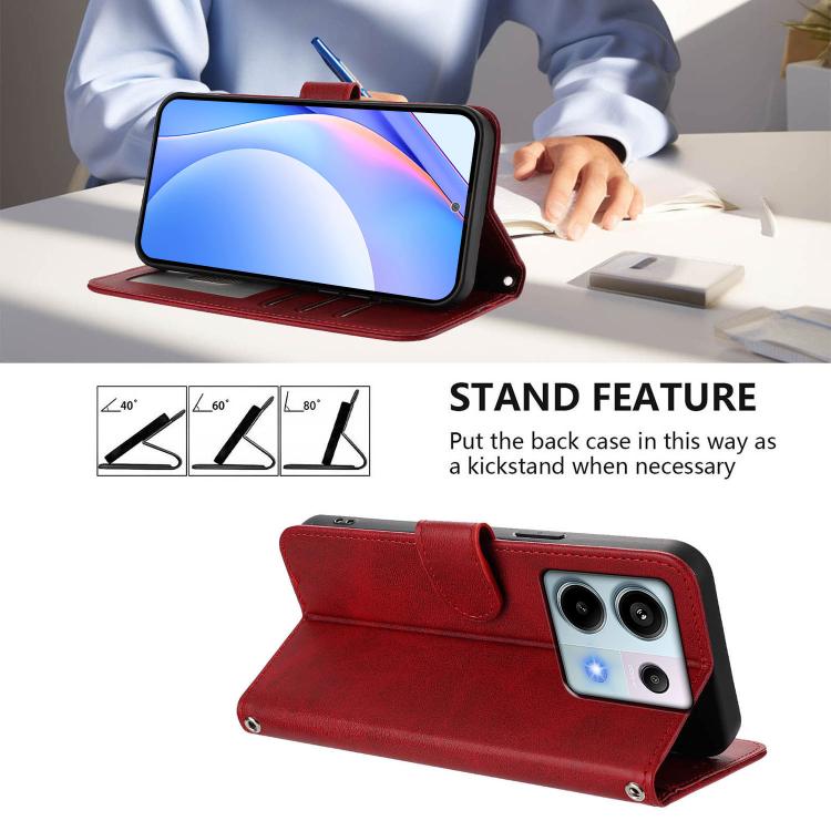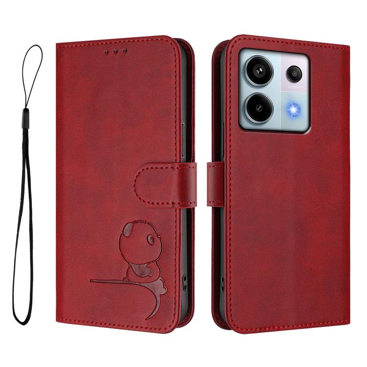 Funda de cuero RFID con estampado de panda y cordón para Redmi Note 13 Pro 5G / Poco X6 (rojo vino)