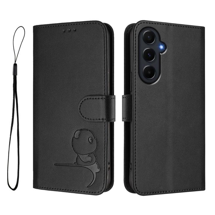 Funda de cuero RFID con estampado de panda y cordón para Samsung Galaxy A55 5G (negro)