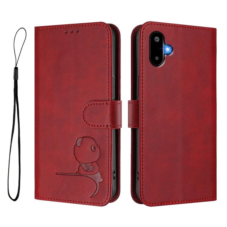Funda de cuero RFID con estampado de panda y cordón para Samsung Galaxy F06 5G / M06 5G (rojo vino)