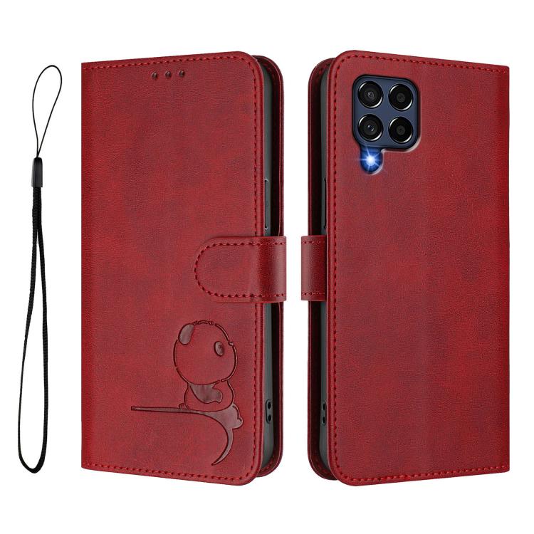 Funda de cuero RFID con estampado de panda y cordón para Samsung Galaxy M53 5G (rojo vino)