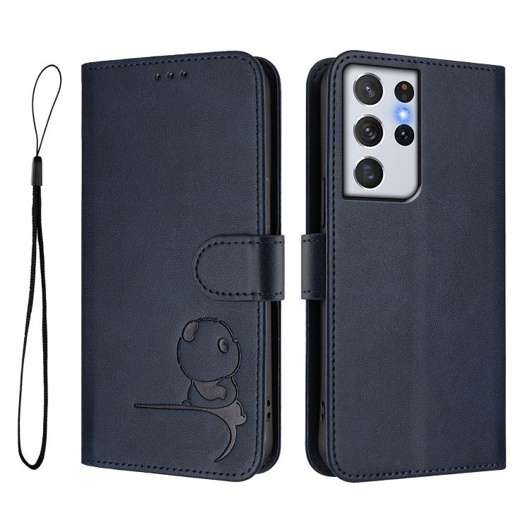 Funda de cuero RFID con estampado de panda y cordón para Samsung Galaxy S21 Ultra 5G (azul)