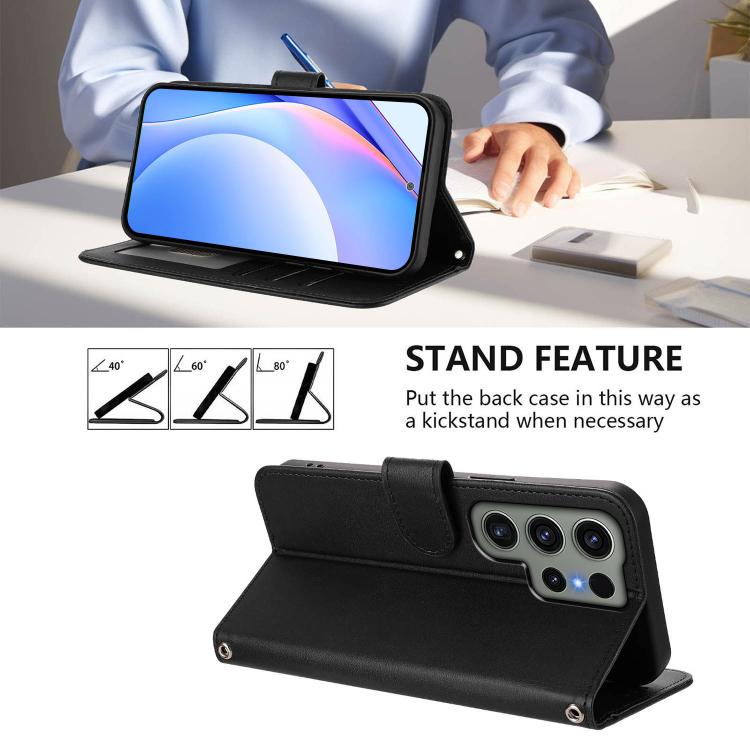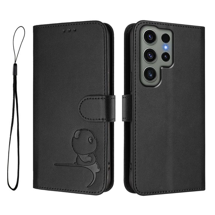 Funda de cuero RFID con estampado de panda y cordón para Samsung Galaxy S23 Ultra 5G (negro)