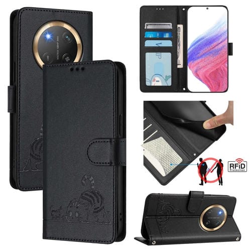 Funda de Cuero Rfid Honor X9C 5G Global con Estampado de Rata y Gato en Relieve y Cordón (Negro)