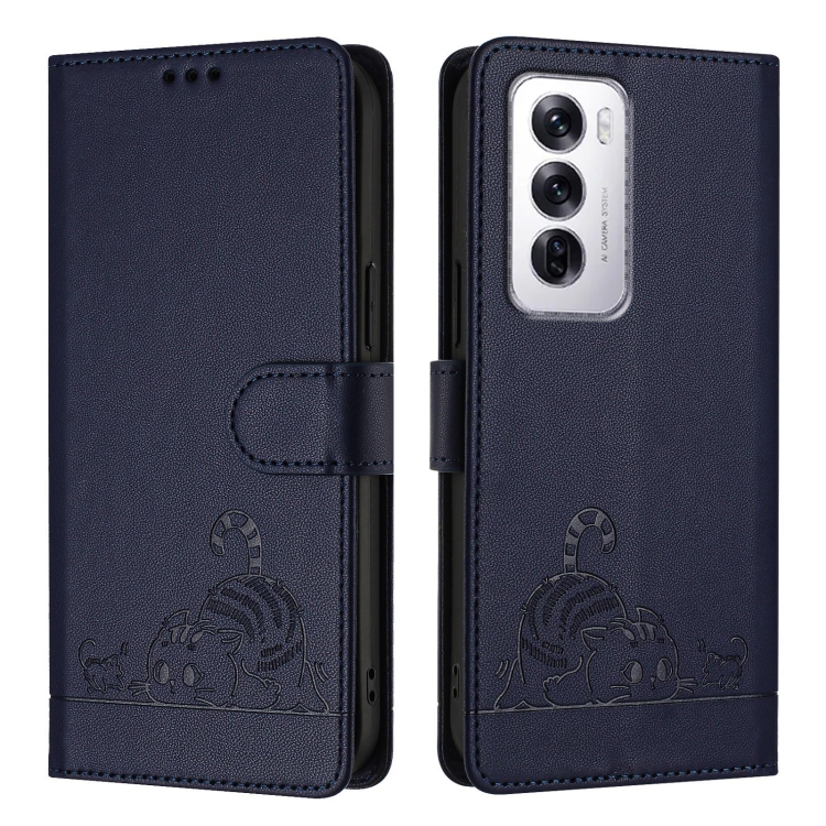 Funda de Cuero Rfid con Estampado de Rata y Gato para Oppo Reno12 Global con Cordón (Azul)
