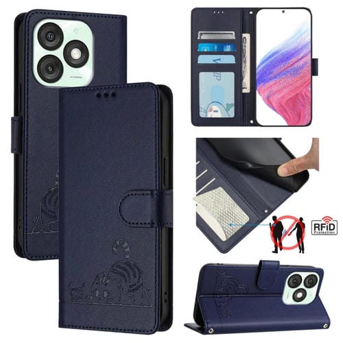 Funda de Cuero Rfid para Teléfono Itel A50 con Estampado de Rata y Gato y Cordón (Azul)