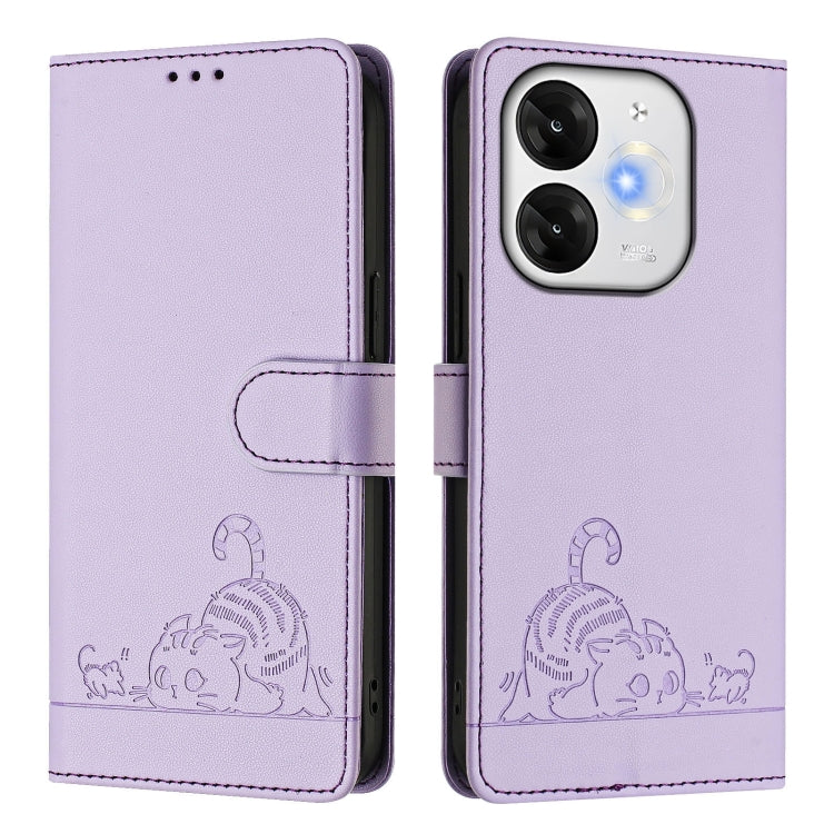 Funda Cuero Rfid Itel A80 4G con Estampado Rata y Gato y Cordón (Morado)