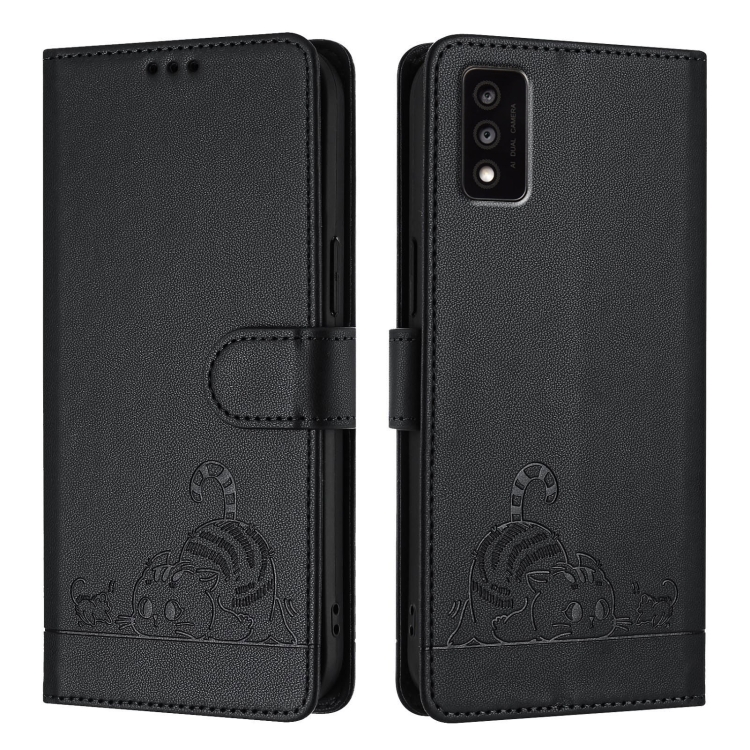 Funda de Cuero Rfid para TCL 30T T603Dl con Patrón en Relieve de Gato y Rata y Cordón (Negro)