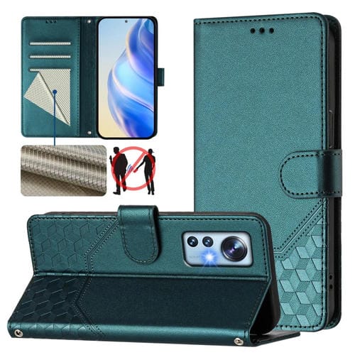 Funda de Cuero Rfid con Relieve de Panal para Xiaomi 12 5G / 12X 5G / 12S 5G (Verde Pavo Real)